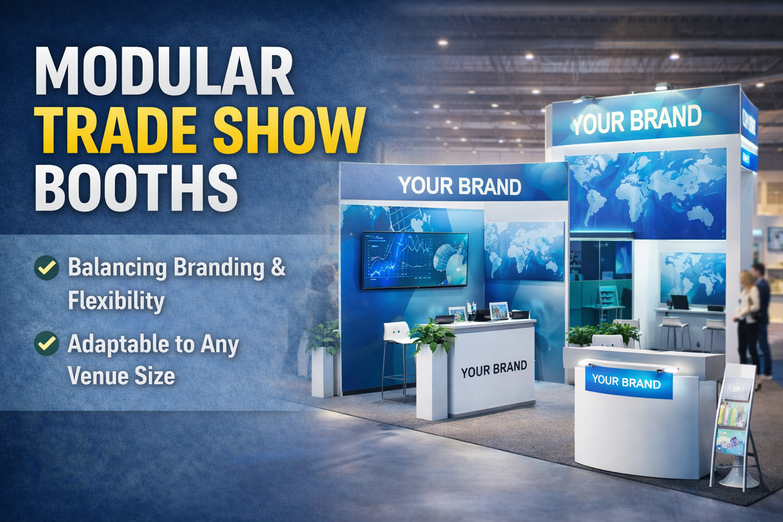 Logos, brand colors, and messaging panels are built into modular systems. These elements stay consistent even when layouts change.